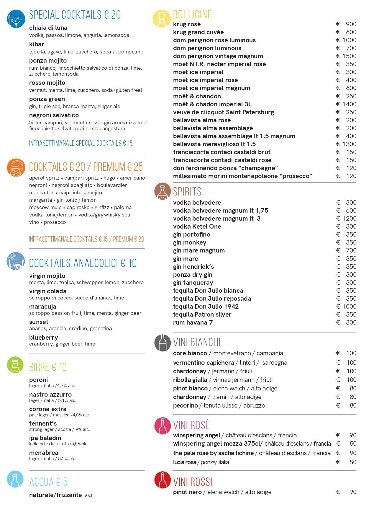 L'ampia selezione di cocktail preparati con maestria soddisferà ogni palato e, se desideri una specialità esclusiva, ti consigliamo di provare il Mojito ponzese, un'interpretazione unica del classico cocktail con l'aggiunta di finocchietto selvatico al posto della tradizionale menta. Il nostro personale esperto sarà lieto di consigliarti l'abbinamento perfetto tra drink e panorama, per garantire un'esperienza sensoriale completa.